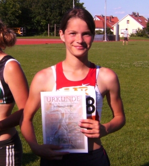 Erst vor 2 Wochen in die Geheimnisse des Speerwerfens eingeweiht, warf sie hier nicht für möglich gehaltene 22,30 m. Damit lag sie nach 4 Disziplinen bereits fast uneinholbar an der Spitze. Beim abschließenden Weitsprung zeigte sie jedoch Nerven. Da sie die beiden ersten Versuche übertreten hatte, mußte der letzte Versuch unbedingt gültig sein. Mit 4,55 m sprang sie auf Sicherheit und konnte somit am Schluss 2401 Punkte holen. Diese Leistung ist zugleich die Qualifikation für die Bayerische Meisterschaft, die am 17. Juni in Herzogenaurach stattfindet.
